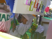 sehingga bisa berhasil maksimal. Setelah menempuh rute pawai, finish di halaman Islamic Centre TKIT Al Ummah dan SDIT Al Ibroh ( yang ini lokasinya di depan rumah Kayla). Ada bazarnya dan pentas juga. Kami pun langsung beli makanan dan minuman. Stand kelas wortel (kelasnya Kayla) jualan es krim. Ini pun dengan pertimbangan agar praktis saja. Tapi aku nggak bisa bantuin jaga stand, karena Kayla minta gendong terus kakinya masih sakit kalau untuk berjalan. setelah selesai makan dan minum serta beli beberapa pernak-pernik Kayla sudah minta pulang sebelum acaranya selesai. Beberapa saat setelah sampai di rumah, temannya datang main di rumah. Main deh mereka, sementara aku sudah ngantuk, sampai tertidur karena tadi malam nyelesain atribut pawai yang satu ini...kerjasama dengan mamanya Paschall nih...