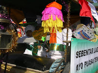 Agak lama juga nunggunya. Setelah sekian lama kami pun diinformasikan bahwa delmannya sudah ada di alun-alun bagian barat. Kamipun segera kesana dan langsung berjibaku menghias delman. tergesa-gesa banget menghiasnya dan hampir bisa dipastikan hasilnya kurang maksimal, karena meleset dari yang telah direncanakan. Menghias belum selesai sudah diinstruksikan untuk berangkat... ya sudah deh...