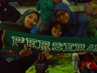 Selain aksi para bintang, yang menarik perhatian kami tentu atraksi dari suporter yang luar biasa heboh dan menghibur. Stadion pun dipenuhi dengan kostum berwarna hijau. Kami pun tak lupa memakai baju warna senada meski bukan kostum suporter Persebaya.