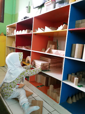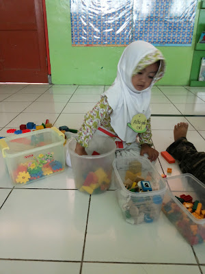 Sementara gantian kedua ustadzahnya"menangani" teman-temannya untuk beberapa pertanyaan tentang gambar-gambar dan lain-lain, Athiyah masih sibuk bermain sendiri. Kali ini dia tertarik dengan balok-balok di Sentra Balok.