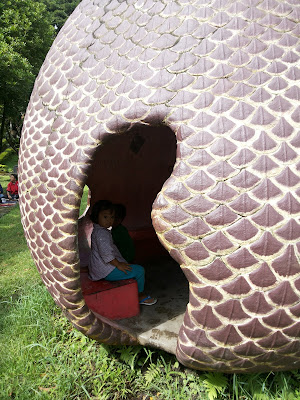 Ada pula area buah-buahan raksasa. Tapi hanya replikanya lhoo... ada apel, salak, strawberry, nanas, jambu monyet. Athiyah dan sepupunya asyik banget bermain di area ini. Kenapa? Karena di dalam replika buah-buahan ini terdapat lubang besar dan ada tempat duduknya. Mereka asyik berada di dalamnya.