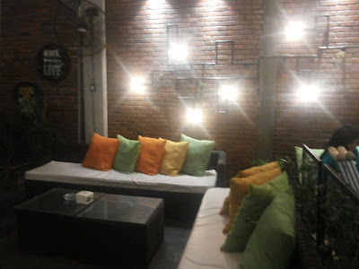 Sekitar jam lima sore satu per satu teman-teman datang, mereka langsung menuju lantai dua. Tak lama aku dan anak-anak turut menyusul mereka. Begitu tiba di lantai dua, aku melihat suasana yang semakin menyenangkan. Terasa banget nuansa santai dan cozy place disini. Dengan berbagai bentuk meja kursi maupun sofa dengan banyak bantal tentunya. Asyik deh pokoknya...