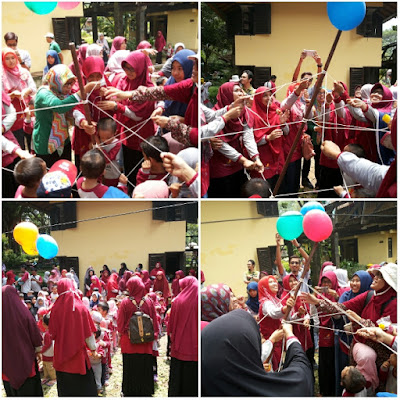 Setelah masing-masing kelompok menampilkan yel-yelnya dimulailah game antara anak dan orangtua. Game yang tujuannya untuk menjalin kekompakan, kebersamaan dan pengaturan strategi ini dilakukan dengan cara meletuskan beberapa balon yang diikat di sebuah tali, lalu ortu bersama dengan anak-anak menarik tali yang mengikat pada sebuah tongkat yang terdapat paku di ujungnya.