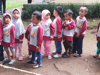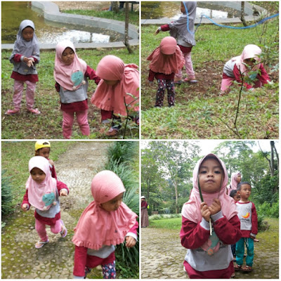 Acara selanjutnya semua peserta anak-anak dan orangtua diajak keluar lapangan. Dibentuklah kelompok-kelompok dari nama-nama binatang. Athiyah masuk dalam kelompok Kucing. Masing-masing kelompok didampingi oleh satu pendamping dariPPLH dan beberapa ustadzah. Udara terasa panas saat itu. Beberapa anak mulai ada yang rewel dan merajuk termasuk Athiyah. Lalu athiyah aku ajak istirahat sebentar, cuci muka dan minum serta makan jajan. Tidak berapa lama kemudian ia pun mau bergabung lagi denga kelompoknya.