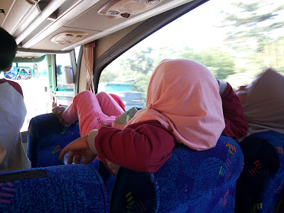 Selama perjalanan selalu bercanda dengan teman-temannya. Ada saja ulahnya. Athiyah dan temannya tidak mau “duduk manis” (orang dewasa kali... harus duduk manis...). Hampir selalu berdiri di kursi bahkan beberapa kali kedua kakinya diangkat dan ditaruh di sandaran kursi depannya. Tidak hanya itu beberapa kali kedua kakinya dipancatkan di kaca jendela sambil kepalanya ditaruh di sandaran kursi. Beberapa kali aku mengingatkan untuk duduk yang baik di dalam bus agar tidak jatuh jika sewaktu-waktu sopir ngerem mendadak. Namun bisa saya Athiyah menjawab, “Bu lihat...aku lho nggak jatuh kan...?” sambil memperagakan aksinya.