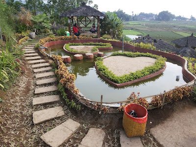 Bener deh, mata ini dimanjakan dengan hamparan sawah dengan tanaman-tanaman yang ditata apik dan instagramable. Suasana pedesaan terasa banget disini. Udara sejuk dan segar pun leluasa untuk dihirup memenuhi rongga paru-paru menyegarkan otak. Ditambah dengan background alami pegunungan yang biru memukau menambah indahnya tempat wisata ini. Back to nature deh pokoknya... Dijamin betah disini berlama-lama. Kami kesana pada tanggal 30 Juli 2014 sekitar jam setengah empat sore. Tepat banget deh menikmati suasana sore santai bersama keluarga dan teman-teman.