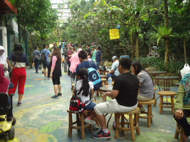 Setelah jalan-jalan melihat burung-burung yang eksotis tidak terasa pegel juga kaki ini. Eh ada meja-meja khusus yang dipersiapkan bagi pengunjung untuk sekedar melepas lelah serta mengganjal perut di Eco Food Court. Kita bisa memilih menu seperti makanan siap saji, french fries, burger, maupun menu sehat seperti sate kelinci, ayam bakar, nasi goreng atau mie dengan harga terjangkau. Untuk minuman ada es krim, jus, minuman segar dan hangat maupun air mineral.