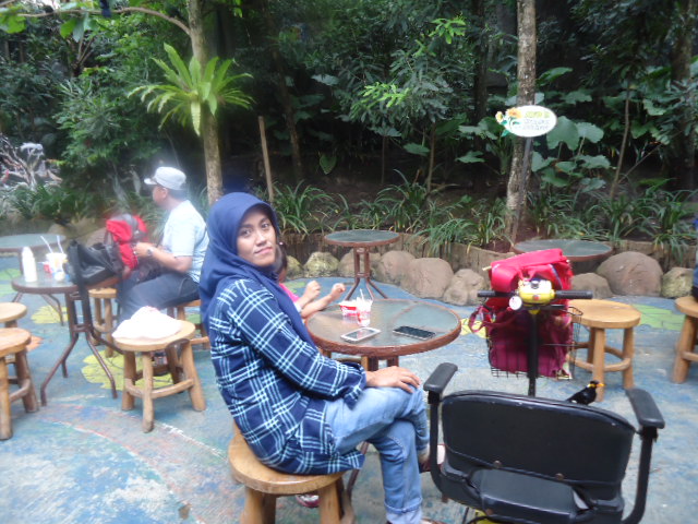 Kami pun berhenti sejenak sambil menikmati french fries dan es krim yang sudah kami pesan. Eh ada beberapa burung yang dibiarkan terbang bebas dan sesekali menyapa pengunjung termasuk kami. Suaranya yang merdu bersautan terdengar merdu di telinga. Tapi Athiyah dan Kayla malah ketakutan saat sang burung mampir di meja kami. Mereka takut dipatuk burung terseut. Ya sudah deh, maunya bersantai agak lamaan tapi gagal deh... Kami pun bergegas melanjutkan perjalanan sambil makan friench fries yang tersisa.